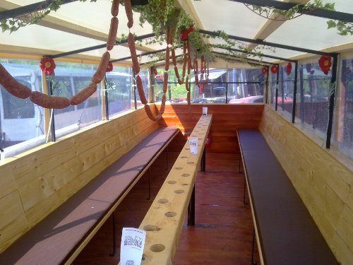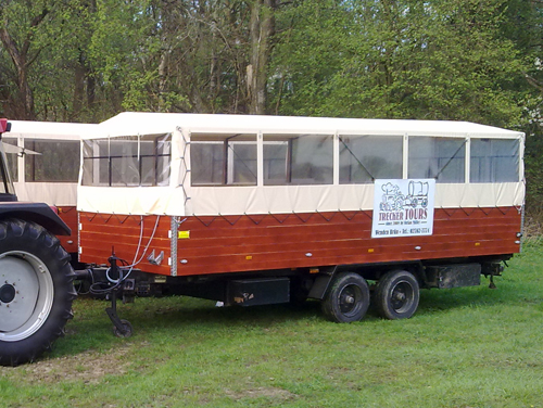 Unsere beiden baugleichen Planwagen bieten mit je 12,5 m Sitzbank Platz für jeweils 25 Personen.